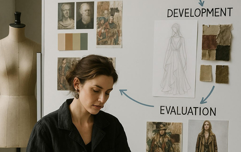 در نهایت، مرحلهی ارزیابی به بررسی انتقادی نتایج اختصاص دارد. در این مرحله، طراحان بررسی میکنند که آیا تمام عناصر طراحی با ایدهی اولیه و نیازهای عملی هماهنگ هستند یا نه. ارزیابی همزمان خلاقانه و دقیق است: ویژگیهای مفهومی و «پیامهای قابل ارائه» فهرست میشوند و سپس بهصورت نظاممند بررسی میشود که آیا هر خروجی طراحی، چشمانداز اصلی را محقق کرده است یا نه. این فرایند ممکن است شامل آزمایش لباس روی مدل، نقدهای همگروهی، یا چکلیستهایی برای تطابق با کلیدواژههای مفهومی باشد (برای مثال، آیا «آزادی» در فرم لباس دیده میشود؟ یا «ولگردی» در بافت پارچه؟). نتایج منفی بهاندازه نتایج مثبت ارزشمند هستند: دادههای بهدستآمده از دانشجویان و طراحان حرفهای نشان میدهند که نقدهای طراحی اغلب کاستیها یا اهداف برآوردهنشده را آشکار میکنند و همین امر باعث شکلگیری چرخههای بازنگری میشود. طراحان در نتیجه به مراحل پیشین بازمیگردند – ممکن است الگویی را اصلاح کنند یا ترکیب رنگها را تغییر دهند – یا حتی به بریف اولیه رجوع کنند. در واقع، پژوهشها تأکید میکنند که مرحله ارزیابی اغلب «نتایجی تولید میکند که امکان اصلاح آگاهانه و توسعه بیشتر را فراهم میسازد» و تنها از طریق این بازخورد است که میتوان فهمید آیا یک راهحل واقعاً مؤثر بوده است یا نه. بدین ترتیب، چرخه کامل میشود: دستاوردهای ارزیابی به تحقیق تازه یا اصلاح اجرای طرح بازمیگردند و این سیستم خلاقانه را بهصورت پیوسته غنیتر میسازند.